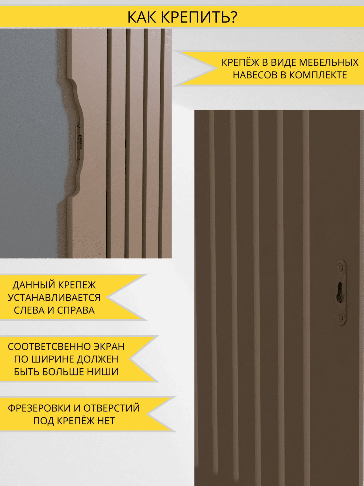 Тип установки: навесной, накладным способом. Наша крепежная система позволяет многократно снимать и устанавливать экраны на батареи без применения инструментов.